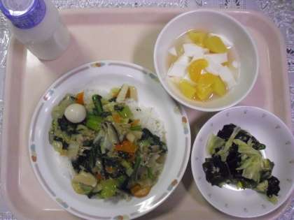 今日のメニューは、中華丼、ワカメサラダ、杏仁豆腐、牛乳でした。