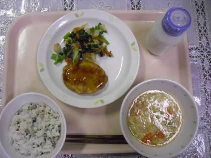 10日のメニューは、ワカメご飯、豆腐の真砂揚げ、おひたし、卵汁、牛乳でした。