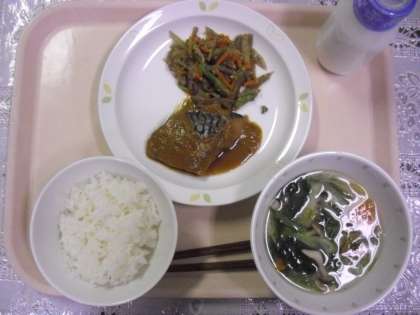 今日のメニューは、ご飯、鯖の味噌煮、五目きんぴら、みぞれ汁、牛乳でした。