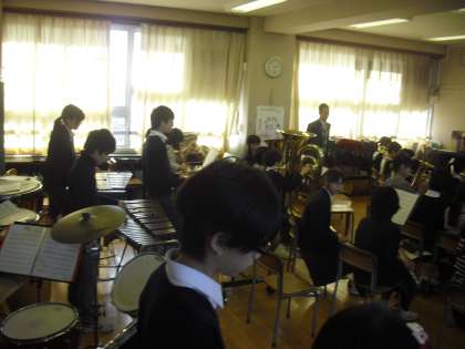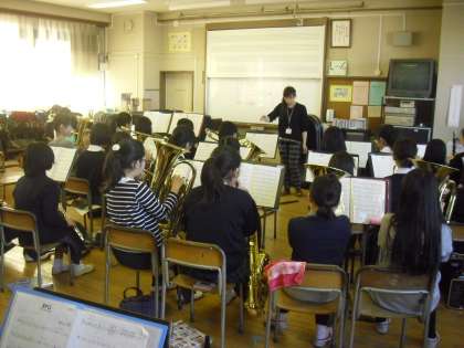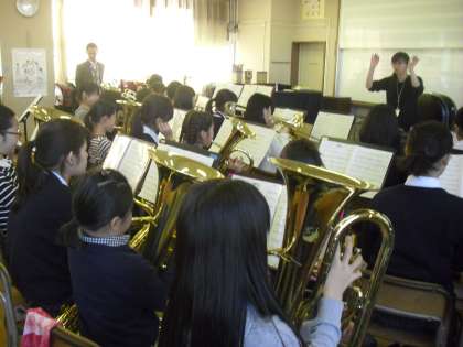 尾山台中学校のブラスバンドの生徒に、本校の合奏クラブの子どもたちが、楽器の演奏に仕方を教わり、一緒に演奏をしました。