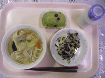 今日のメニューは、ほうとううどん、ひじきサラダ、よもぎ蒸しパン、牛乳でした。