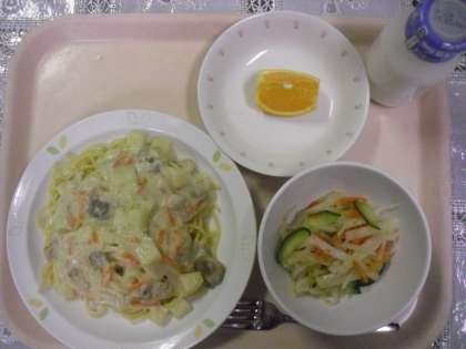 今日のメニューは、クリームスパゲティー、大根サラダ、清美オレンジ、牛乳でした。