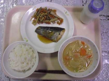 今日のメニューは、ご飯、鰆の照り焼き、レンコンのきんぴら、ご汁、牛乳でした。