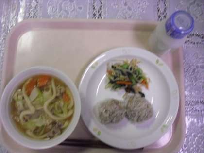 今日のメニューは、煮込みうどん、肉団子のもち米蒸し、やさいのからし醤油、牛乳でした。