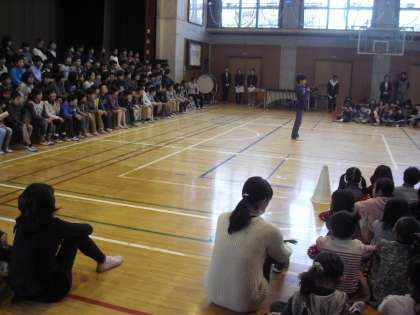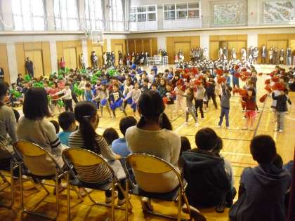 今日、6年生を送る会を5年生がいリードして、全校で行いました。初めの言葉の後、1年生が「歌とダンス」で、感謝をしました。
