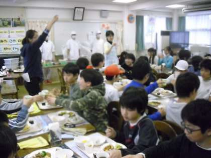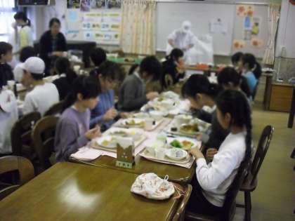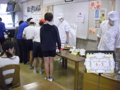 卒業をお祝いして開始した「6年生のバイキング給食」今日で最後で、3組です。