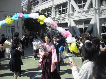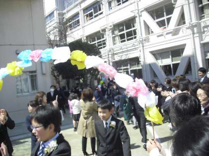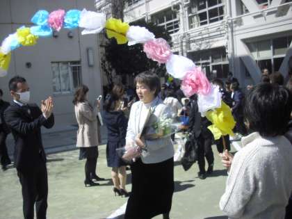 校庭で、みんなに見送られ、旅立ちました。保護者。地域の皆様、これからもこの子どもたちを支えてください、宜しくお願いします。卒業おめでとう!