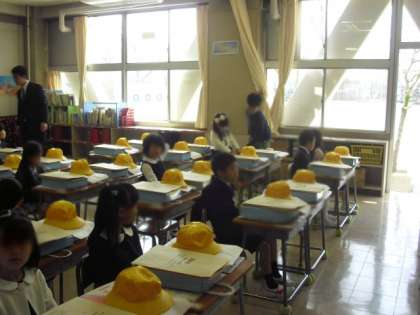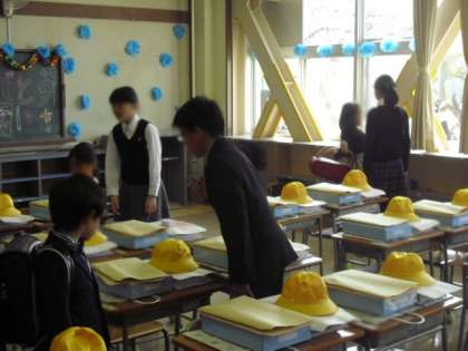 6年生に教室まで案内してもらった1年生。入学式が始まるまで、新しい教室で待機です。ここでも6年生が、いろいろとお世話をしています。