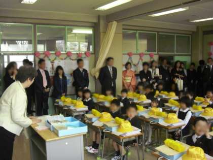 教室に戻った1年生は、担任の先生から学校生活や学習についてなどのお話を聞きました。先生から質問されると、しっかりと答えることもできました。
