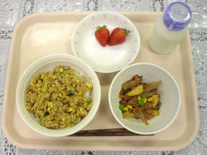 今日の給食は、そぼろ丼、変わりきんぴら、いちご、牛乳です。
