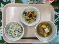献立は、わかめごはん、鶏のから揚げ、豚汁、すりおろしりんごゼリー、牛乳です。