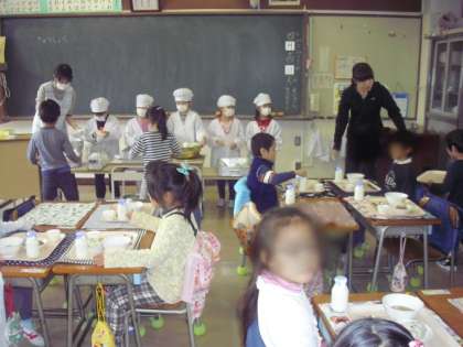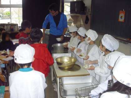 みんな初めての給食に大喜び。給食の準備、はいぜん、食事、かたづけ、と、覚えることがたくさんあります。一つ一つ先生の話をよく聞きながら上手にすすめることができました。