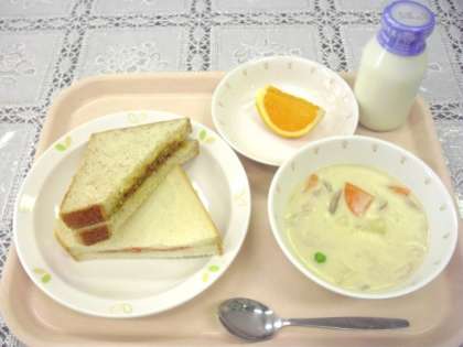 献立は、2色サンド(ドライカレー、いちごジャム)、クリームシチュー、清見オレンジ、牛乳です。