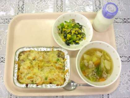 献立は、えびドリア、小松菜ソテー、白いんげん豆のスープ、牛乳です。