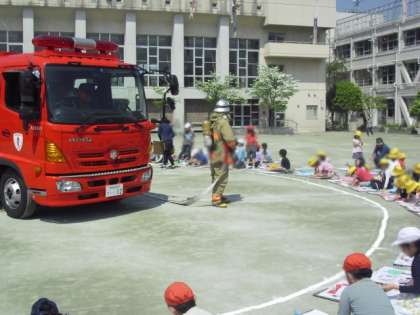 毎年恒例の「はたらく消防写生会」を行いました。玉川消防署から、消防士さんたちが、はしご車とポンプ車を運んできてくださいました。