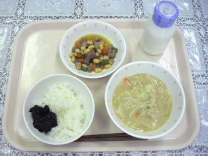 献立は、ごはん、のりの佃煮、五目豆、おから団子のみそ汁、牛乳です。