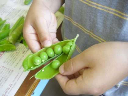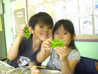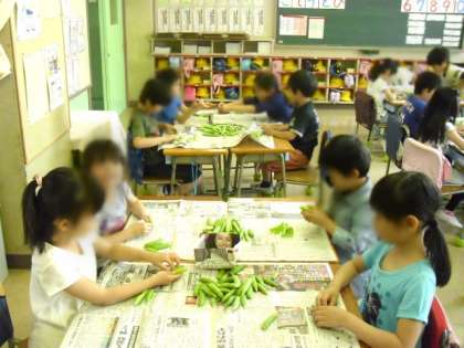 5/8 1年生 給食のお手伝い 公開日 2015/05/08 更新日 2015/05/08 給食 1時間目に、グリンピースのさやむきをしました。 この後、給食室に持って行って全校分の給食になります。 「いいにおい」「ふわふわしてる」「はじけるよ」など、実がぎっしりつまったグリンピースをさわりながら言っていました。 いいね(0)