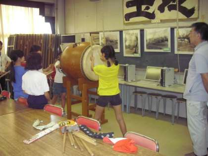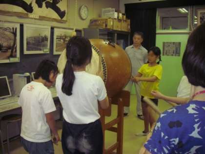 昼休み、校内の一室に集まり、音楽に合わせてリズムよくたいこをたたきます。今日は地域の方にきていただき練習をみてもらいました。大きなたいこをずっとたたいていると汗がでてきます。