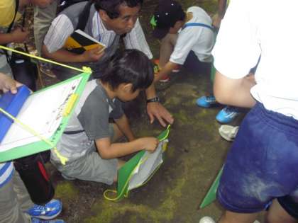 水辺に降りて水温をはかったり、鳥の声を聞いたり、植物の名前を教えてもらったり、それぞれのグループが、ゲストティーチャーの先生を囲んで熱心に話を聞き、メモをとっていました。「このあたりは何万年も前に海だった。」というお話もありました。実際に貝の化石を発見し、びっくり!学校の身近にこんなにすばらしい学習の場があるのです。