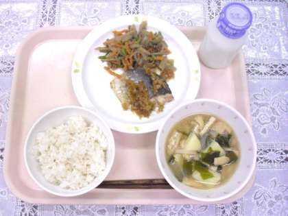 献立は、麦ごはん、あじの南蛮焼き、五目きんぴら、みそ汁、牛乳です。