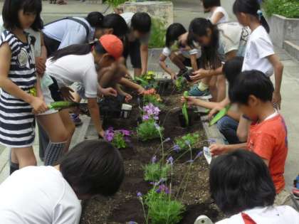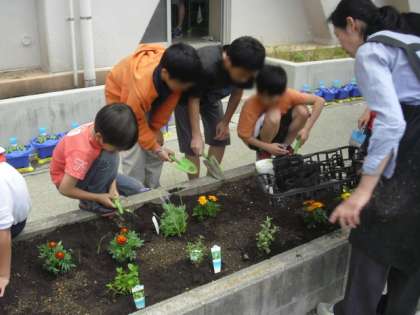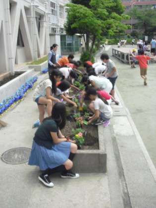 飼育栽培委員会のお友達が、校庭の花壇に花を植えました。5・6年生は、運動会の練習や学習だけでなく、委員会活動にもしっかり取り組んでいます。