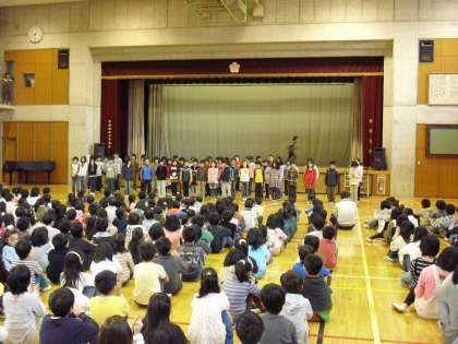 2月1日の全校朝会では、4年生が教科「日本語」の学習の成果を発表しました。