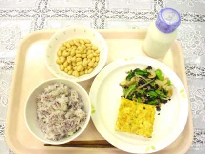 献立は、ゆかりごはん、擬製豆腐、磯辺あえ、ぶどう豆、牛乳です。