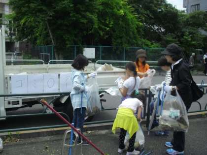 学校に着いてから目黒通り沿いと、学校の向かいの三角地帯の2チームに分かれて、ゴミを拾い集めていきました。子どもたちも一生懸命でした。いつの間にかゴミで袋がいっぱいになってしまいました。改めてゴミの多さに驚くとともに、ポイ捨てをしないことや、きれいにすることの気持ちよさを感じることができました。