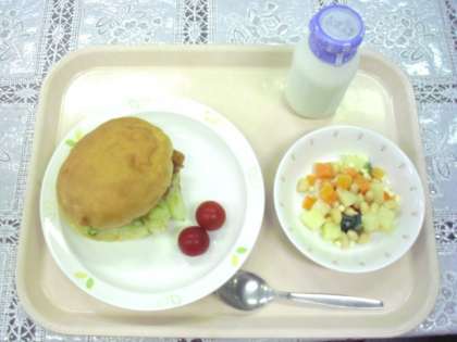 献立は、フィッシュバーガー、大豆のコロコロサラダ、ミニトマト、牛乳です。