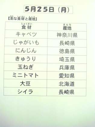 運動会の練習も大詰めです。疲れて食欲がなくなる子もいます。今週は、配膳しやすい、食べやすい献立を中心にしています。ミニトマトも冷蔵庫で冷やしているので、冷たくおいしいです。体を使うときほどしっかり食べて、エネルギーをとりましょう。