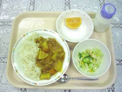 献立は、チキンカレーライス、シーフードサラダ、セミノール、牛乳です。