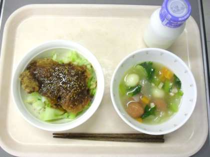 5/29 今日の給食 公開日 2015/05/29 更新日 2015/05/29 給食 献立は、みそカツ丼、紅白白玉スープ、牛乳です。 明日の運動会に向けて、「カツ」と「紅白の白玉」です。白玉は、約2500個を調理師さんたちが丸めてくれました。スープがにごらないように、ゆでた後に水に数回さらしてにごりをとります。子どもたちのために、一手間を惜しまずに調理してくれています。 いいね(0)