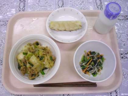 献立は、豚キムチ丼、塩ナムル、パイナップル、牛乳です。