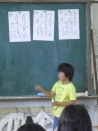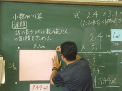 算数「少数のかけ算」の学習で、単元の半分くらいまで進んでいます。今日は、辺の長さが少数でも面積の公式を使えることを学習しました。5年生のお友達は、少数×少数の答えの小数点の位置に気をつけていました。そして、何よりも感動していたのが、担当の先生が用意した面積図と答えがぴたりと一致したことでした。先生が教材をしっかりと準備することで、子どもたちの感動を呼び、計算への興味を高めることができました。