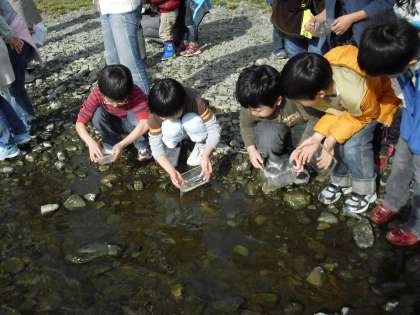 12月から2か月間、心をこめて育ててきたさけの稚魚を放流しました。卵の時から見守ってきたさけたちに、一人ひとり励ましの言葉をかけ、大きな声でさけの歌を歌って送り出しました。4年たったら大きくなって帰っておいで。