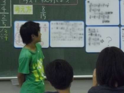 算数「分数のわり算」です。2/5÷3/4の「計算のしかたを考え、答えを求めよう」という問題に取り組みました。