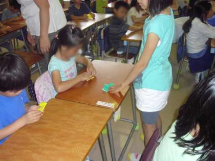 朝の時間、6年生の係の人が1年生の教室にお世話にきてくれています。持ち物を片付け、学習の準備をした後は、読み聞かせや簡単なゲームをして1年生を楽しませてくれます。今日は折り紙を教えてくれました。1年生にとってあこがれの6年生、とても頼りになる6年生です。1年生は、教えてもらった折り紙で今日1日よく遊んでいました。