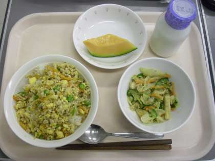 献立は高野豆腐のそぼろ丼、いかのごまだれサラダ、クインシーメロン、牛乳です。