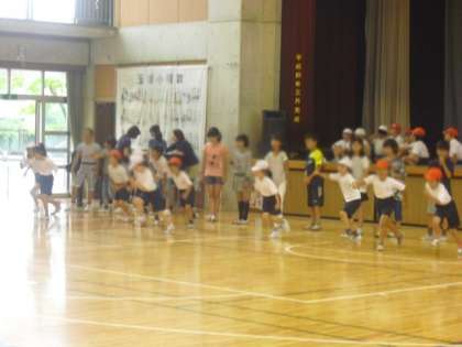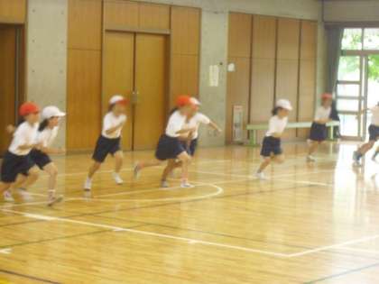 2年生は5年生に補助してもらってシャトルランを行いました。20mの距離を一定の時間以内に何往復もしていきます。だんだんペースが速くなるのできつくなります。時間内に走れないとそこで終わりになります。5年生もはじを一緒に走りながら、リズムに合わせて走るペースをつくってあげました。今、何回目を走っているかも数えてあげていました。