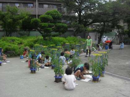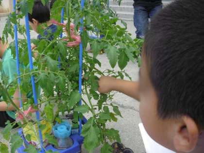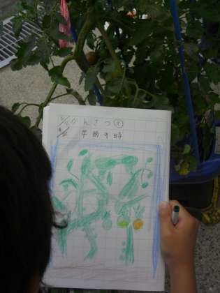 「たくさんなっている。」「赤ちゃんがついている。」などと、みんな大喜びでした。大切に育てているミニトマトに、実がたくさん付いている様子を観察しました。