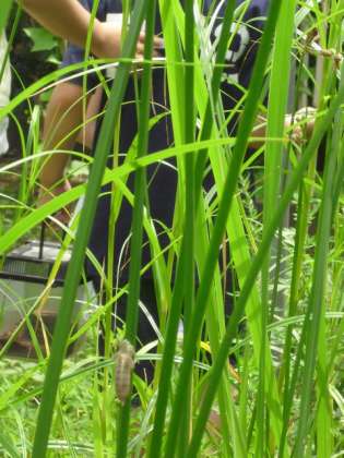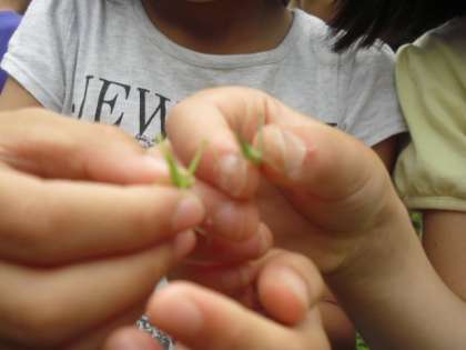 2年生のお友達が、ビオトープでヤゴの抜け殻とバッタの赤ちゃんを見つけました。よく探してみるとビオトープには、水生生物や陸生生物がたくさんいます。