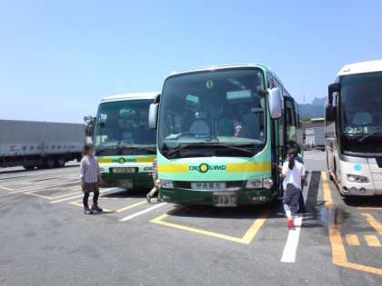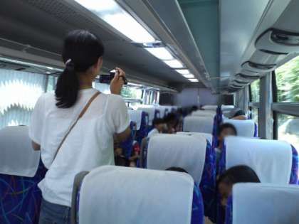 バスの中ではバスレクで盛り上っています。クイズ、ビンゴ、カラオケ。一号車ではアナと雪の女王をみんなで熱唱しました。