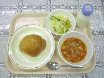 献立は、ウィンナーロールパン、ポテト入りフレンチサラダ、ミネストローネ、牛乳です。今日は、給食室の手作りパンです。19kgの粉を朝からこねて発酵させて、ウィンナーに巻き付けました。焼きたてのおいしいパンは大人気でした。