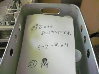 6年生から給食室にお手紙も入っていました。調理師さんは大量の生地をこねるので大変でしたが、おいしく食べてくれ嬉しいです。