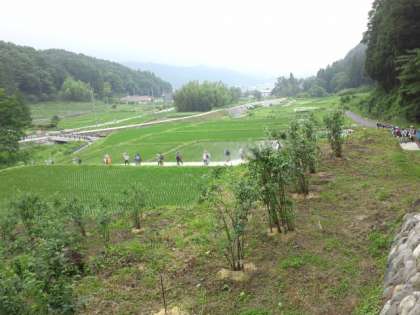 水田が広がり、茅葺き屋根の家もあるのどかな風景を楽しみながら歩いています。