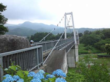 「ふれあい橋」は川場のシンボルの一つです。りっばな吊り橋を渡れば、もうすぐ田園プラザに到着します。