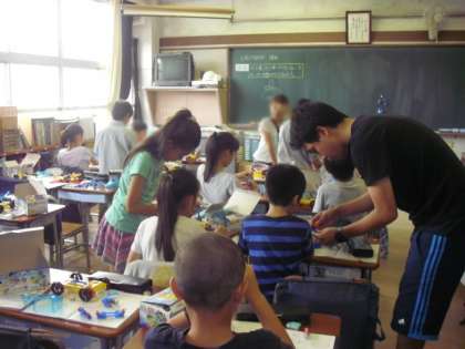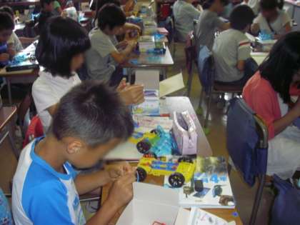 4年生は理科でモーターの勉強をしています。今日は実験セットを使いモーターを動かしてみました。接続がうまくできて、モーターが動き、プロペラが勢いよく回ると「やった!」と満足そう。まだうまく回らない子がいるとみんなで教え合い、協力し合う姿が見られました。