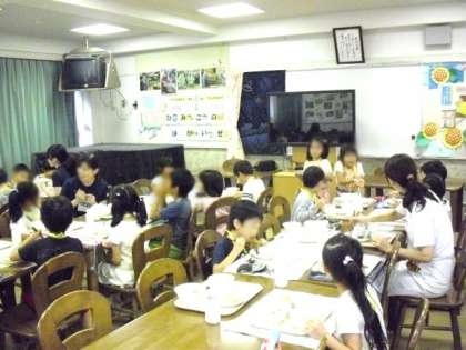 今日は、1年2組が初めてランチルームで給食を食べました。ランチルームでは食べ物や栄養のお話を栄養士の先生から聞いたり、マナー良く楽しく食べるところということを説明しました。そして、いつも給食を作ってくれる調理師さんが配膳に来てくれ、一緒に給食を食べました。普段なかなか話す機会が無いので、お互い楽しい一時となったと思います。