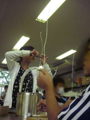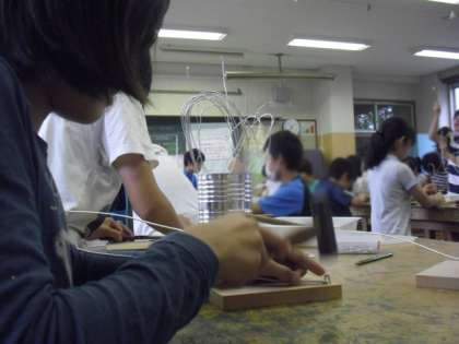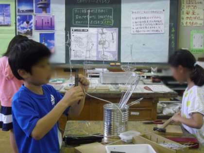 自分だけのスカイツリー造りに取り組んでいるのは5年生です。ペンチや金づちを使ってデザインだけでなく、丈夫に造ることも一つのポイントです。