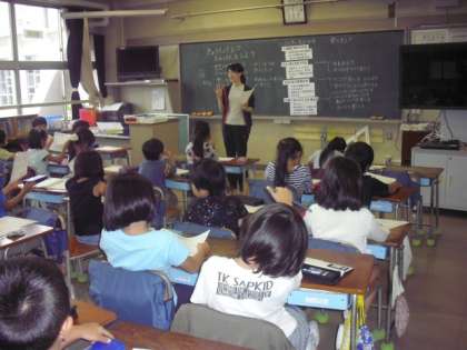 給食室のビデオをみたあと、ワークシートをもとに給食室の内部のようすについて説明がありました。普段は見られない場所に入っての特別授業になります。みんな注意深く話を聞いて楽しみにしているようでした。